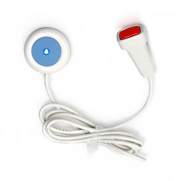 呼び出しベルWOLFのナースコール型送信機は、従来のひとつボタン送信機にコードと握り部分を組み合わせた設計です。